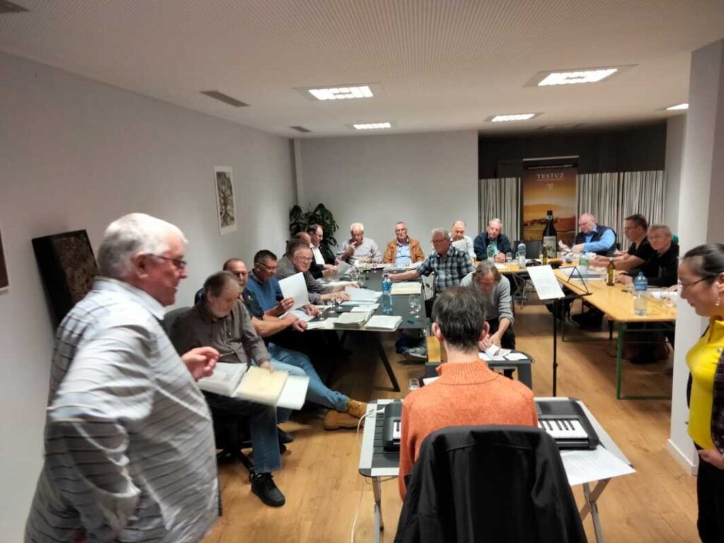 Pour la salle : Elle est un peu étriquée mais la sonorité y est agréable. Il faut en tout cas élargir le cercle (le U) pour laisser la place aux 1er et 2ème ténors qui étaient coincés contre le mur. (Voir photo)